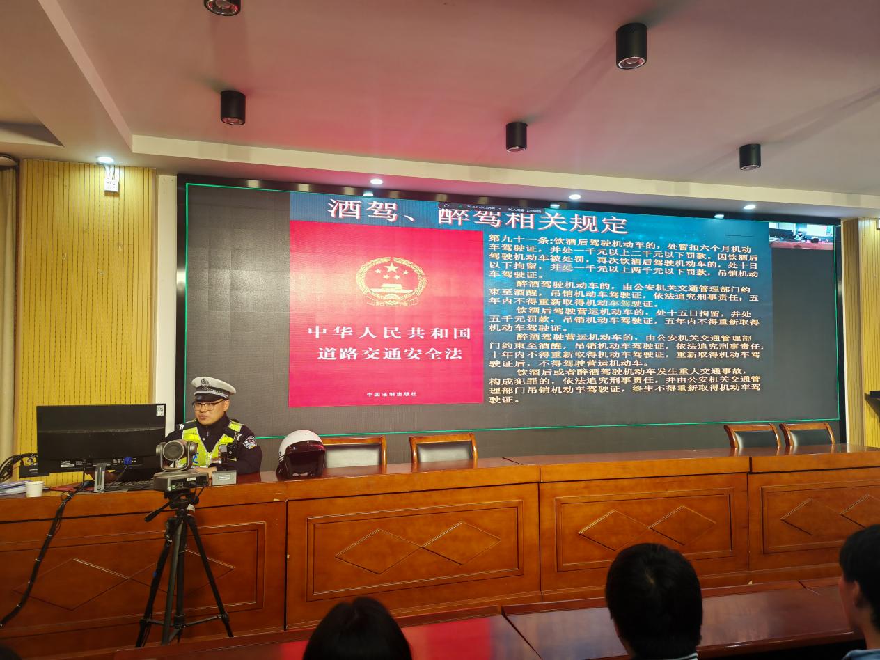 通过播放酒驾警示教育片,再现酒驾引发的法律后果,并详细解读酒驾与醉驾的判定标准、处罚措施:酒驾(≥20mg/100ml)将面临驾驶证暂扣、罚款甚至拘留;醉驾(≥80mg/100ml)直接构成危险驾驶罪,承担刑事责任,且犯罪记录影响升学、就业等人生重要环节。