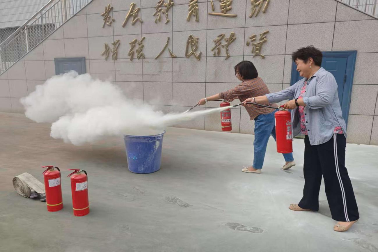 在政教处张念老师指导下,参训人员分组使用干粉灭火器进行灭火演练。通过“一提二拔三握四压”口诀强化操作规范,确保人人会用。