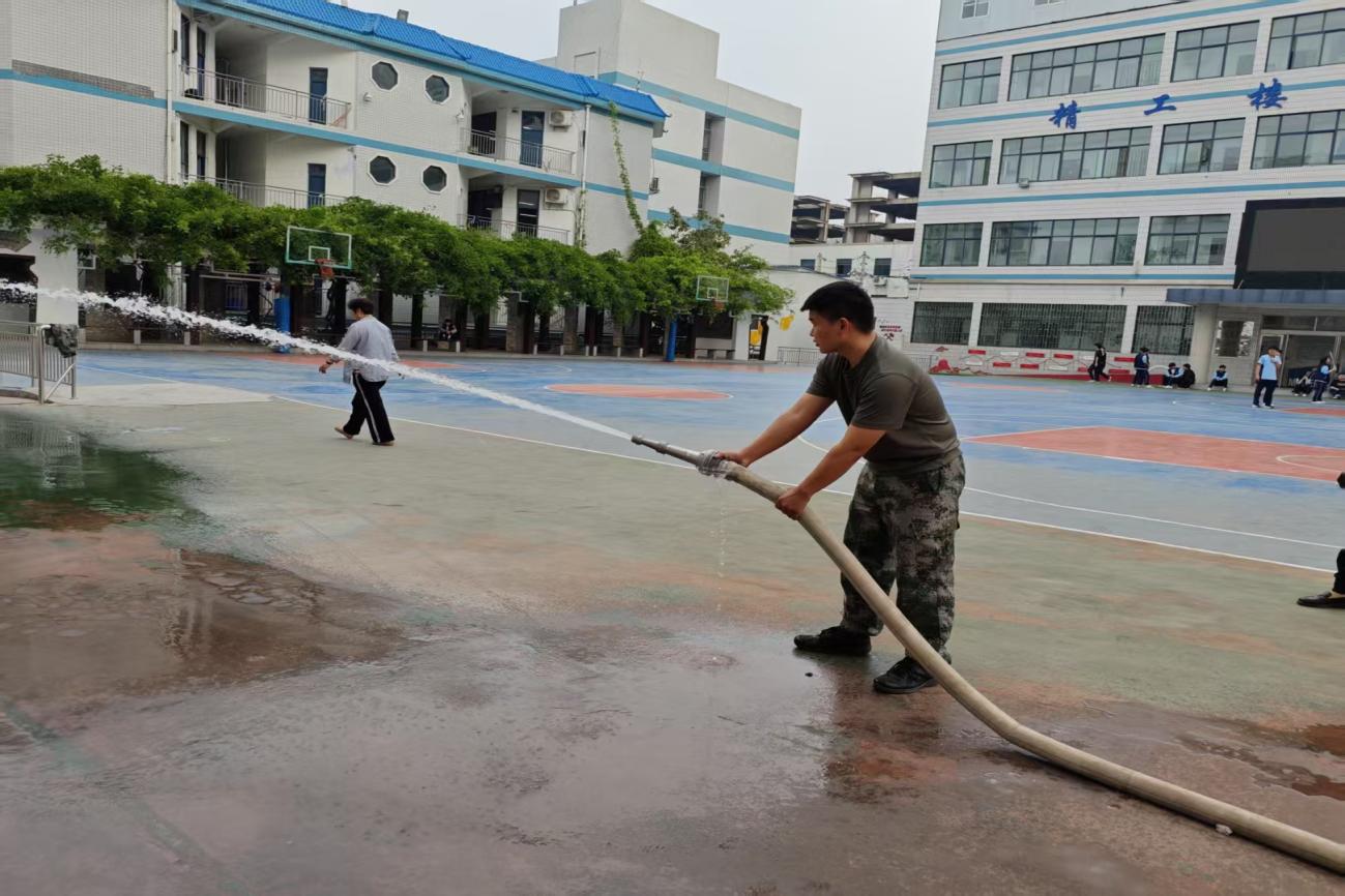 在政教处贾志伟老师指导下,参训人员分组使用消防水带、消防栓进行喷水演练。通过“一拉二开三接四射”口诀强化操作规范,确保紧急情况下人人都能才正确打开消防水带。