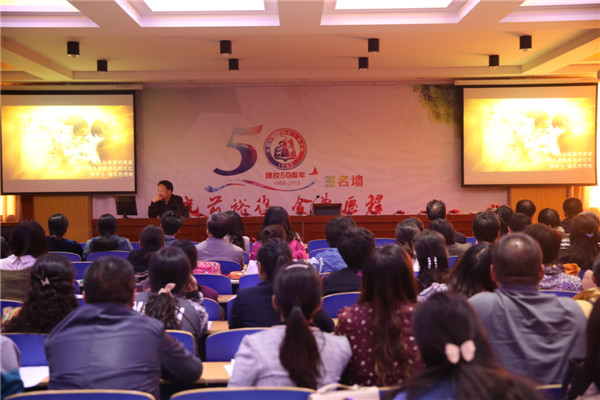 精彩的校庆视频展示拉开了活动的序幕,光前裕后,金典历程,短短13分钟的视频,展示了学校建校50年来的风雨历程,一张张旧照片见证了学校50年来的沉淀与蜕变;承载着无数师生的希望和梦想;勾起了在座教师们美好的记忆与憧憬。