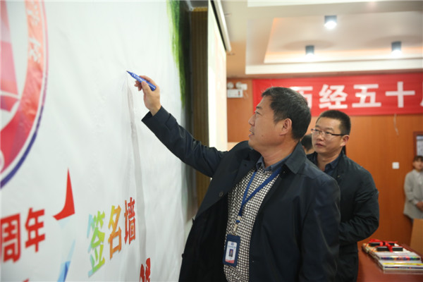 仪式最后,校领导班子成员及全体教职员工的分别在签名墙上写下自己名字,为郑州市电子信息工程学校50岁的生日送上诚挚的祝福。