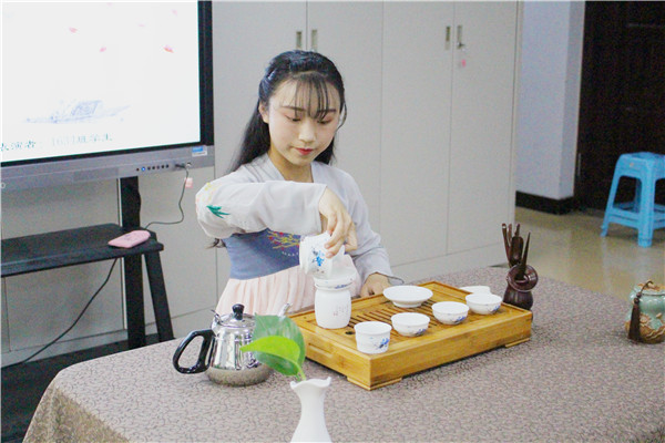 2018年5月16日,下午第三节课,伴随着学校图书馆里阵阵茶香,学校艺术设计系旅游及形象设计工作室的张晓艳老师带领自己的弟子们为大家献上演了一场精彩的茶艺表演。此次茶艺课由工作室主持人王俊锋老师主持,在温馨的寄语中拉开了茶艺展示的帷幕。
