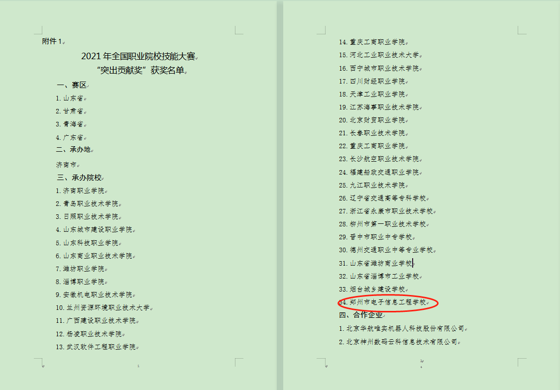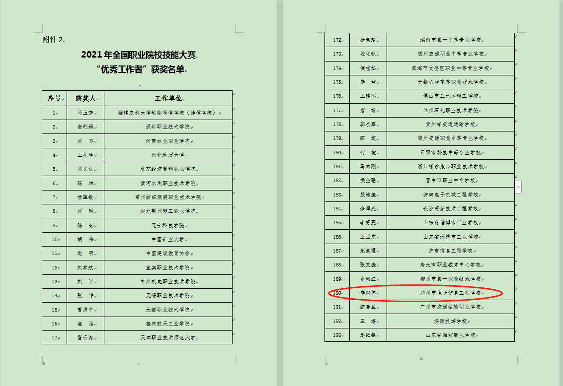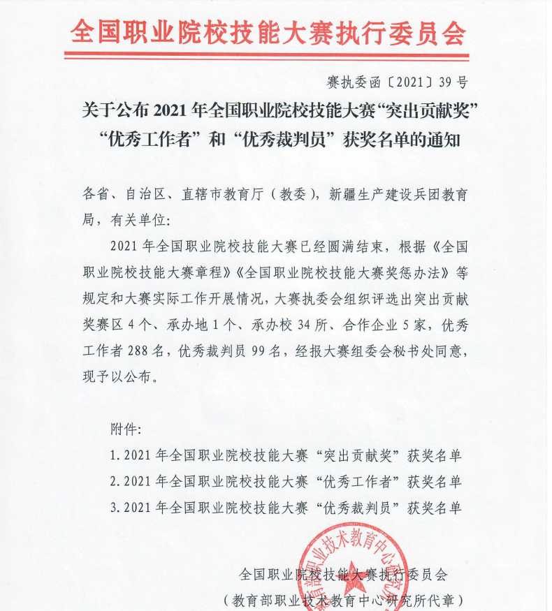 12月9日,全国职业院校技能大赛执行委员会公布了2021年全国职业院校技能大赛突出贡献奖、优秀工作者和优秀裁判员获奖名单,郑州市电子信息工程学校及副校长李向伟分别获得“突出贡献奖”、“优秀工作者”荣誉称号。