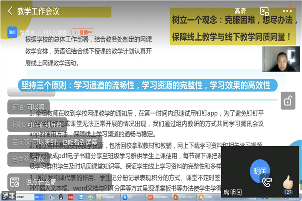其次,邀请学校四位教师进行了经验交流。政治组的李得亮老师在线上交流分享环节提到,线上教学相比线下教学缺少一些仪式感,他采用签到功能代替上课铃声及上课、起立、问好流程,讲课过程中及时关注互动聊天区,与同学们进行互动,利用答题卡功能每节课预设2-3个小问题随时检验学生听课情况,让学生有置身课堂的真实感;语文组的周泉老师在分享时讲到网课具有局限性,对比上学期网课,学生们这次更加适应,老师们教学也更加熟练,利用网络授课的优势打破局限、解决问题是本次线上教学的重点工作;数学组的刘媛媛老师作为本学期新进教师,她以第一次线上教学的切身感受,结合数学组教研会老师们分享经验就网络授课教师容易形成自我独白的错觉等问题与大家进行交流分享;英语组罗菲老师在分享时首先提到应树立一个观念:克服困难,想尽办法,保障线上教学与线下教学同质同量!线上教学受时间、空间、网速等多方面因素影响,前期大量准备工作不可避免,一定要保持学习通道的流畅性,学习资源的完整性,学习效果的高效性。随后,罗菲老师分享了英语组老师在教学过程中一些有效小方法供大家参考学习。