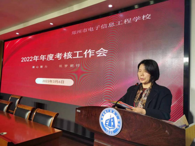 会上,郑州市电子信息工程学校校党委书记、校长李京辉对2022年度学校工作进行总结:从坚定党建引领,推进学校工作高质量发展到坚持德育为先;从坚持质量提升,不断提升教育教学成果,到坚持质量提升,不断提升教育教学成果;从坚持守正创新,持续加强校园文化建设;再到协同配合、攻坚克难、统筹推进新校区建设等方面回顾了学校2022年度工作。他详细介绍了学校重点工作开展情况,突出了学校特色工作的亮点及取得的成绩,同时也指出了学校发展过程中遇到的现实困难和存在的挑战,希望全体教职工珍视如今发展机遇,敢于正视困难,勇于接受挑战,超前识变,积极应变,以强烈的责任意识和担当精神,推动学校事业在新的起点再上新的台阶。