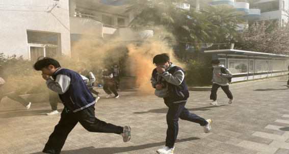 活动现场,随着刺耳的警报声响起,师生们迅速进入应急疏散逃生演练状态,在班主任和任课老师的引导下捂住口鼻、低头弯腰,按照指定路线迅速撤离到了操场安全地带。