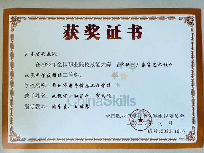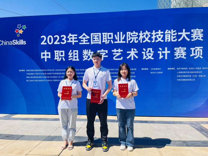 8月30日至9月1日,2023年全国职业院校技能大赛(中职组)“数字艺术设计”赛项在江苏省南京市举行。郑州市电子信息工程学校参赛选手朱悦宁、和家平、宋雨欣在资深教练周乐生、王聪慧老师的指导下,凭借良好的合作能力、扎实的专业知识和出色的操作能力,斩获此次大赛团体二等奖。