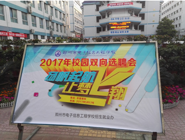 5月17日上午,郑州市电子信息工程学校为2015级毕业生“量身定做”的校园招聘会在学校举行。本届招聘会共吸引了近50多家知名企业参会,格力电器、京东方科技、海尔空调、长城宽带、新天科技、中国电信、中华财险、丹尼斯、裕达国贸、卡来顿大酒店、超凡装饰、河南省通信设计院等企业提供涉及计算机、电子、艺术设计、旅游酒店管理等专业500余岗位。