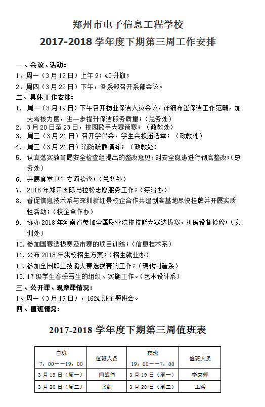 2017-2018学年度下期第三周工作安排