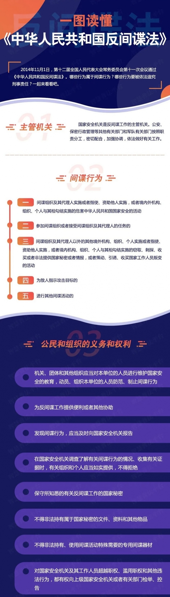 《中华人民共和国反间谍法》(简称:反间谍法)于2014年11月1日第十二届全国人民代表大会常务委员会第十一次会议通过,国家主席习近平签署第16号主席令予以公布。