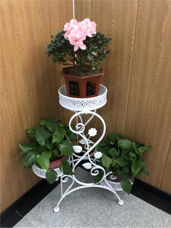 办公楼楼梯拐角处盛开的杜鹃花朝气蓬勃