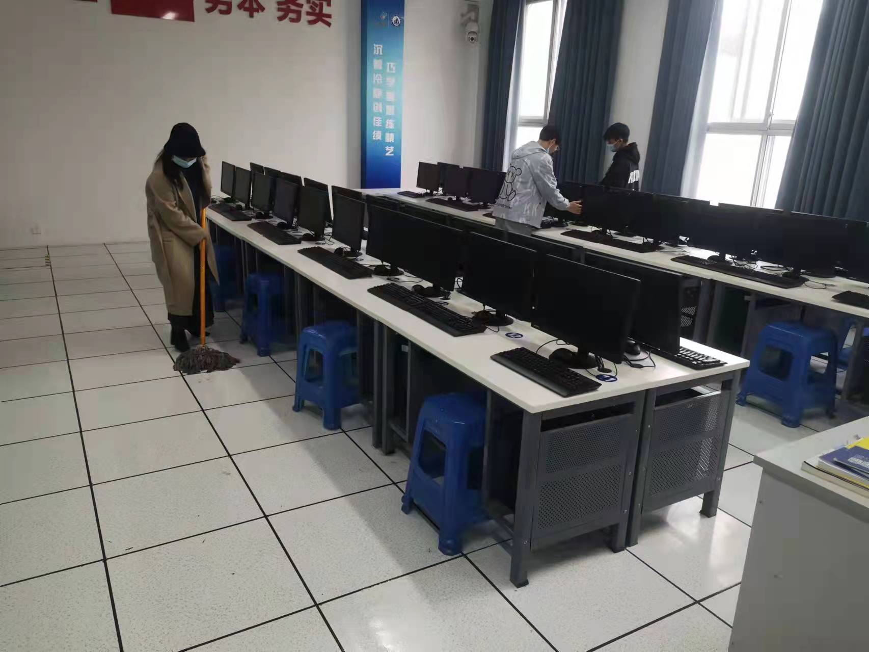 另外,为了给大家一个舒适、安心、整洁的实训环境,实训处老师不辞辛苦,亲力亲为,每周带领设备管理员对机房进行一次卫生大扫除,不怕脏,不怕累,严格把控机房卫生,并做到每天通风,每周消杀,以保证师生的身心健康。