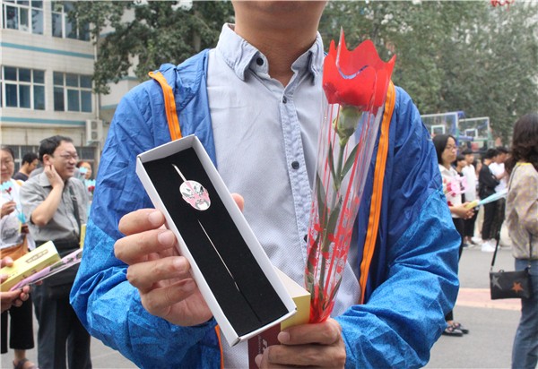 早晨的升旗仪式上,1616班韩宇桐、1622班任鑫鹏同学用深情的朗诵向全校老师表达了节日的祝福和学子的感恩,深情的诗句让在场老师们深受感动。随后,校团委委派各班团支书代表全体学生,向老师们送上真挚的祝福,祝老师教师节快乐,祝老师工作顺利,祝老师生活幸福。他们的礼物是表达感恩之心的康乃馨和寄托中华韵味的脸谱书签,以此感谢老师的教导。小小的礼物捧在手上,老师们感受到甜甜的暖意,脸上都展现出笑容。