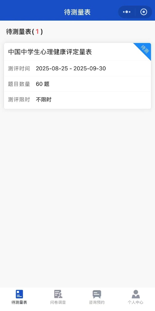 ①登录后进入测评主界面(图3),点击量表名称即可进入测试。