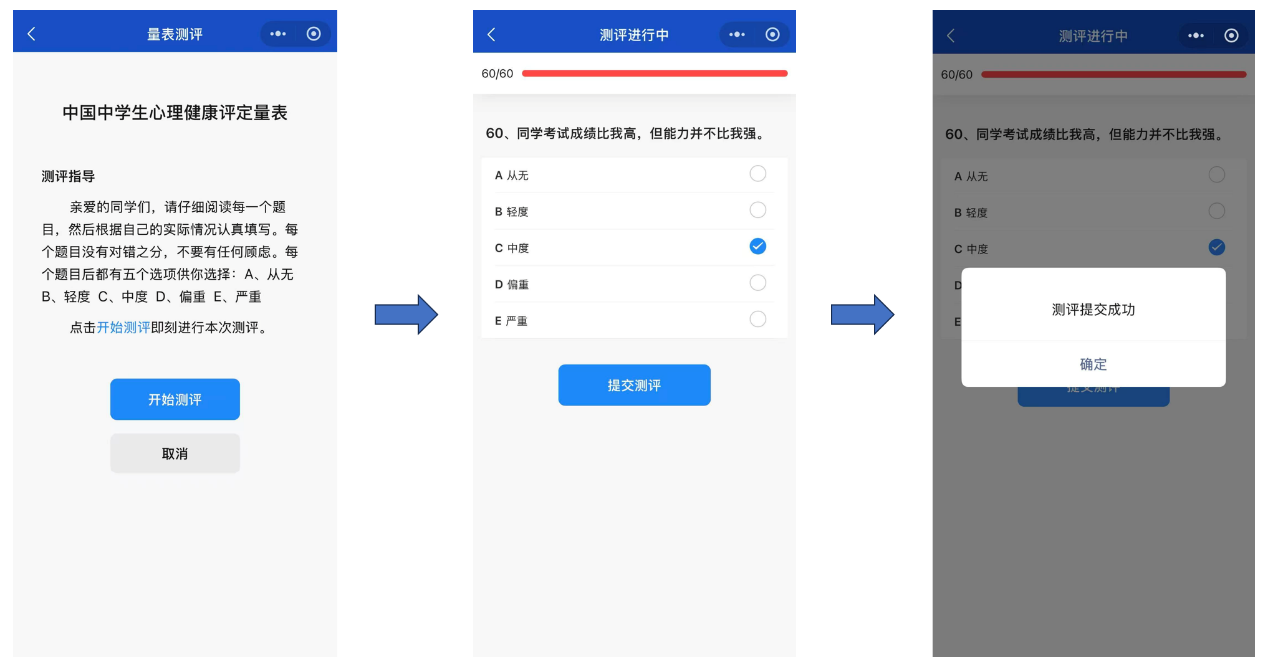 ②阅读测评指导语后,点击“开始测评”进行作答。每道题目选择完成后自动跳题,无法返回上一题修改,所有题目完成后,点击“提交测评”即该量表测试结束,具体操作流程见图4。