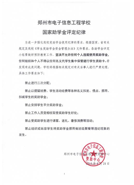 2019秋季学期国家助学金申请登记通知 郑州市电子信息工程学校国家资助政策申请简明手册一、国家免学费1. 范围:一、二、三年级全部正常学籍在校生免学费。2. 所需材料为:⑴国家免学费登记表。(开学后资助中心领取)⑵本人正式身份证复印件(没有身份证,用户口本人页复印件)。⑶本人一寸证件照片一张,红白蓝底都可以。二、国家助学金1. 范围:一、二年级涉农专业、集中连片地区(26个县)农村籍学生(不含县城)和非涉农家庭经济困难学生(包含建档立卡家庭学生)。2