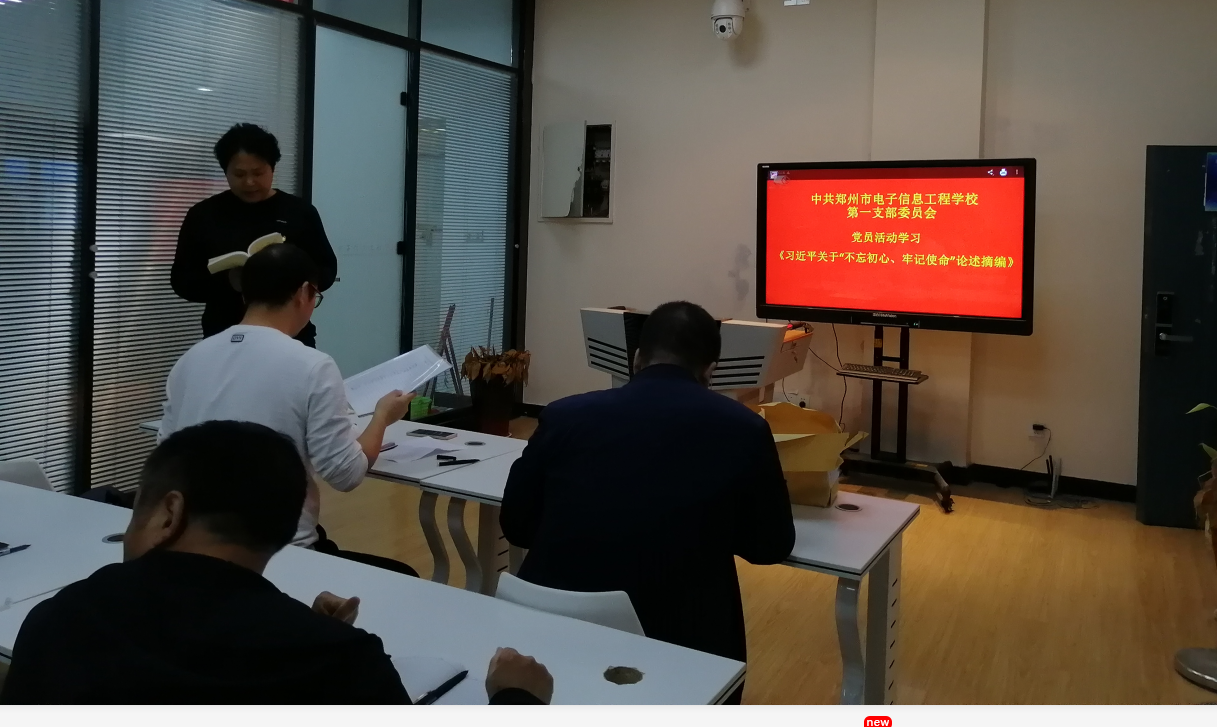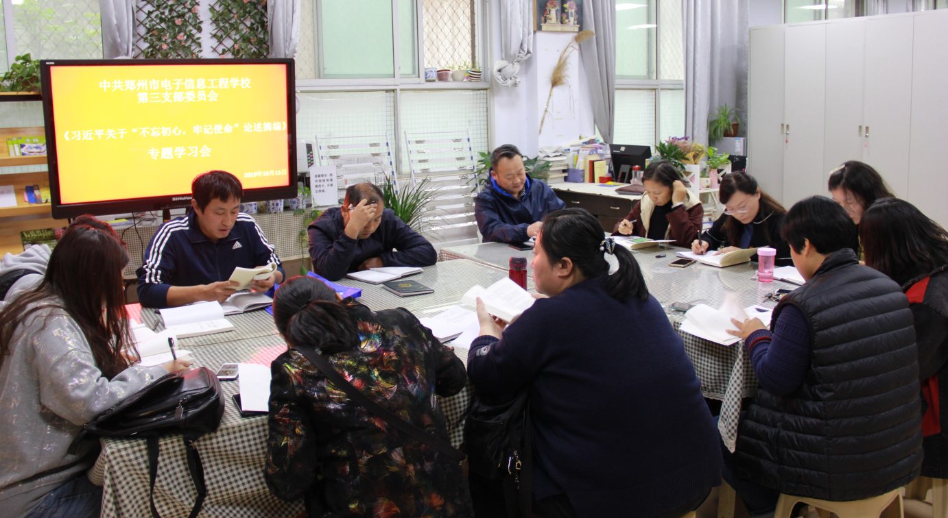 在深入开展“不忘初心、牢记使命”主题教育活动之际,为了不断加强党员教师队伍的政治学习教育,2019年10月15日下午,郑州市电子信息工程学校各党支部集中学习《习近平关于“不忘初心、牢记使命”论述摘编》五、把政治建设摆在首位,不断增强“四个意识”、坚定“四个自信”、做到“两个维护”的主题党日活动。