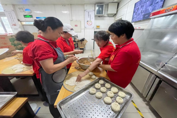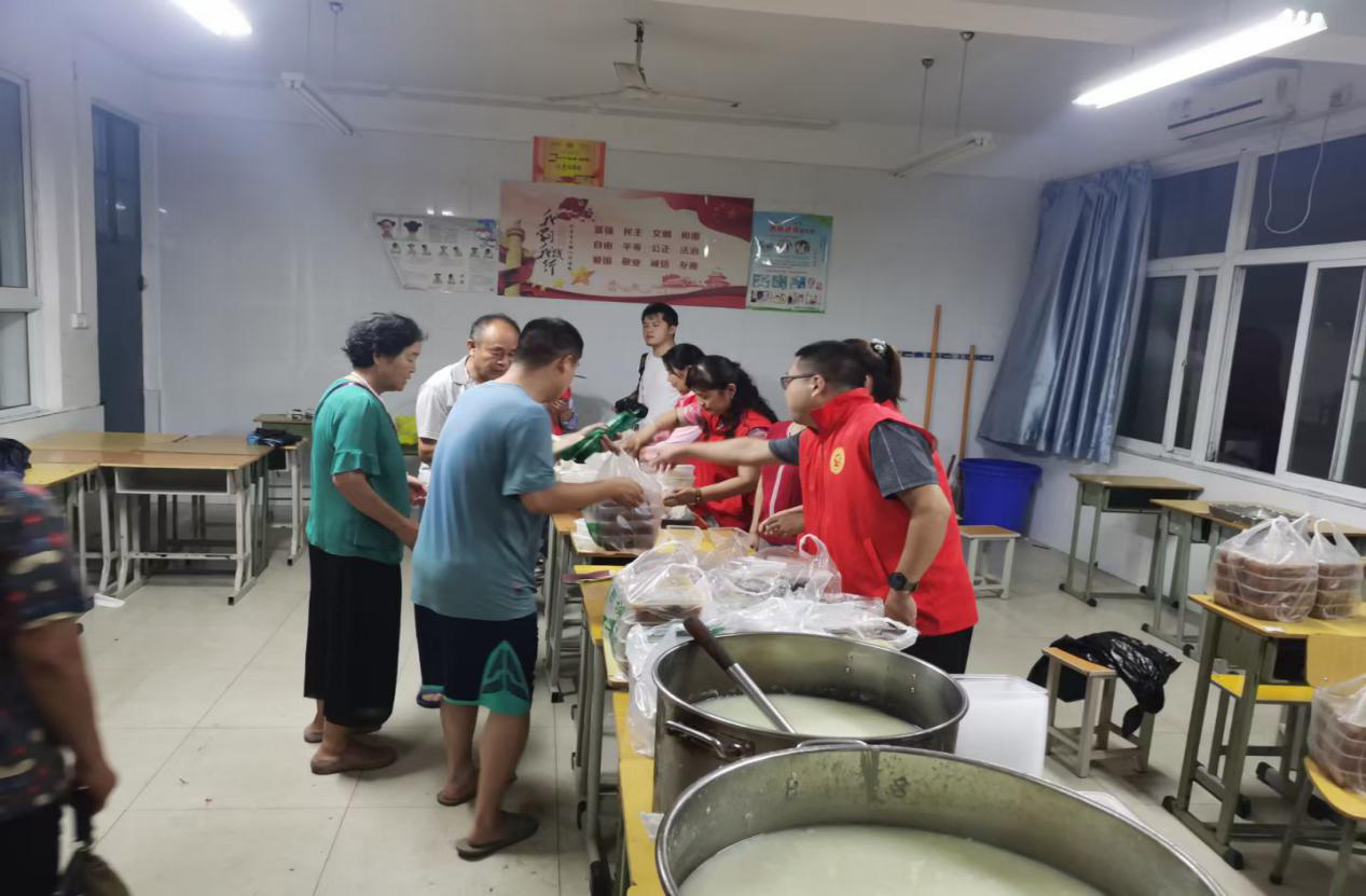 二是支部联建,保障生活。为确保群众能在安置点吃好、睡好、生活好,街道多方协调,临时党支部充分发挥党组织“战斗堡垒”作用,联系辖区合记烩面、方秀华胡辣汤等辖区单位送餐,并紧急联建单位电子信息工程学校协调70余间学生宿舍,发放被褥230套、军大衣55件,解决了居民吃、喝、住等基本需要。在临时党支部的号召之下,各界志愿者踊跃参与,共招募到社区各界志愿者达99人次,包括市政府办公厅、中原工学院、郑州市电子信息工程学校师生、颖河健步队、中机六院及绿东村街道、思源社区等社会各界志愿者。志愿者中有一只特殊的队伍,濮阳市宋丽萍爱心志愿服务队,队员多以60岁以上人员为主,他们自备面、肉、油等物资,志愿为受灾群众免费提供包子,连夜开始和面、备馅,每天制作3000个包子,提供给中原区各街道受灾严重地方,感动了无数个热血沸腾的受灾群众。