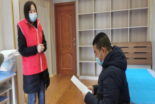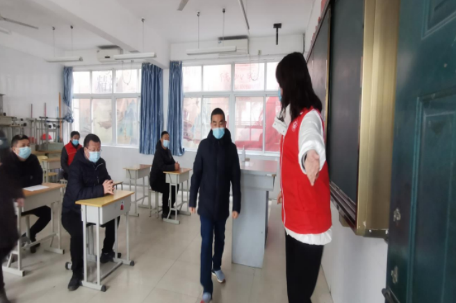 志愿者们依次通过行李消毒、核验健康码、核验国务院通信大数据行程卡、核验一书一表、测量体温、手消毒等流程,随后按照导引图指示到达班主任接待点报到,在班主任处登记报到后,沿闭环路线返回寝室和教室。