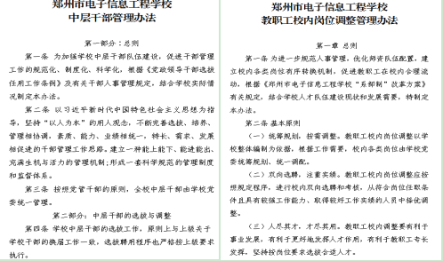 制定《郑州市电子信息工程学校中层干部管理办法》《郑州市电子信息工程学校教职工校内岗位调整管理办法》