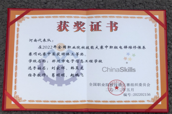2022年全国职业院校技能大赛中职组“电梯维修与保养”赛项于9月14、15日在晋中市职业中专学校举行。郑州市电子信息工程学校参赛选手刘家祥、韩龙昊代表河南省出征此次国赛,面对高手如云的赛场,他们不畏强者,沉着应战,为学校摘得该项目团体三等奖。