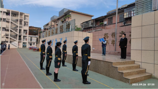 9月26日上午,郑州市电子信息工程学校开展升国旗仪式,伴随着雄壮的国歌,升旗仪式正式开始。国旗班队员迈着矫健的步伐,护送鲜艳的五星红旗进场。伴随着《义勇军进行曲》,五星红旗在晨光中冉冉升起,全体教职工和学生列队整齐、庄严肃立、行注目礼,齐声高唱国歌,表达对祖国的赤诚之心和美好祝福。随后,全体师生举起右拳,向国旗宣誓。