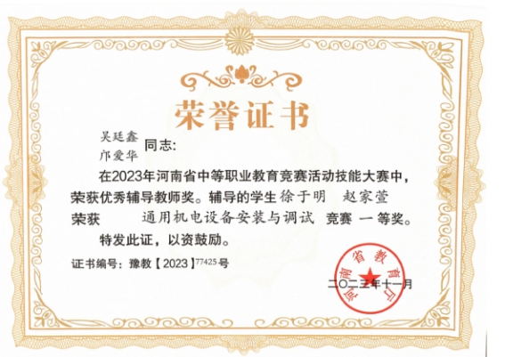通用机电设备安装与调试赛项获奖证书