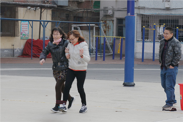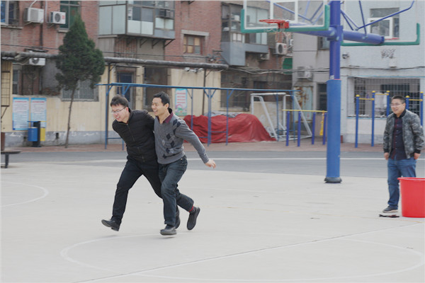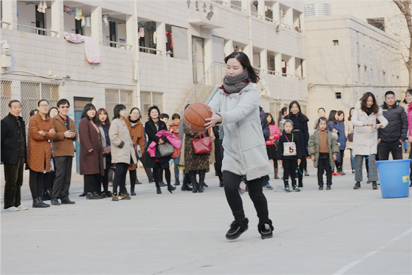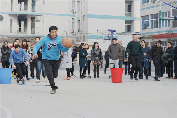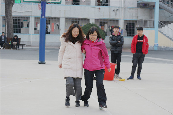 按照比赛规则,参赛老师分为五组,每组十人,两人一组,要先后完成50个跳绳后,运球到50米外的汇合,再绑上绑腿两人三足协力返回。短短的十分钟内,参赛老师们积极参与,各尽其力,既有竞争的活力,又有协作的默契。即便偶有老师慢了下来,搭档也会尽力赶上来。有的老师不慎摔倒,其他老师会马上前来救援,替补参赛。虽然是彼此竞赛,却总有暖人的情绪,真正展现了学校的节日氛围和对女教师的关心。