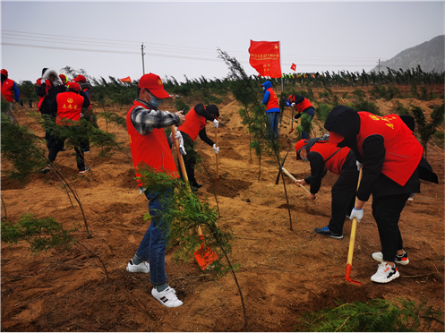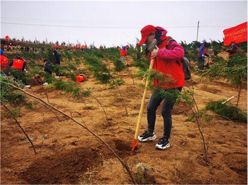 在植树现场,大家相互合作,默契配合,挥锹铲土、扶直树苗、培实新土、提桶浇水各个环节有序开展,在不到2个小时的时间里,植树百余棵,圆满完成植树任务。
