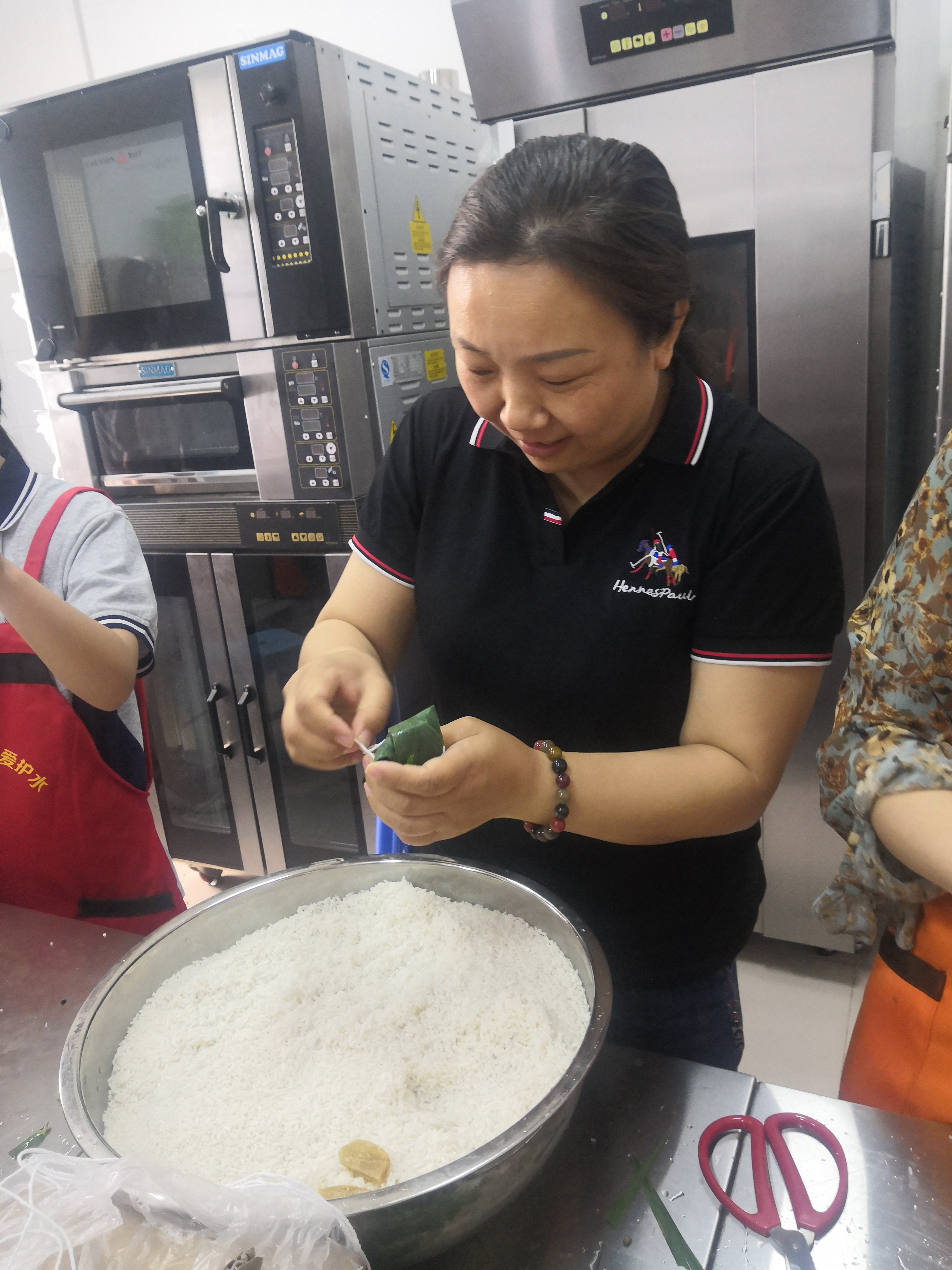 在学校的烘焙实训室,同学们兴奋地围在老师们的身边学着包粽子的手法:一折叶,二盛料,三压实,四包,五扎绳,看似简单,但要做个漂亮的粽子还是需要一点功夫的,在老师和同学们的共同努力下,红豆粽、蜜枣粽出笼啦!虽然包出来的粽子大小不一、形状各异,但是大家完全沉浸在自己动手的快乐中。