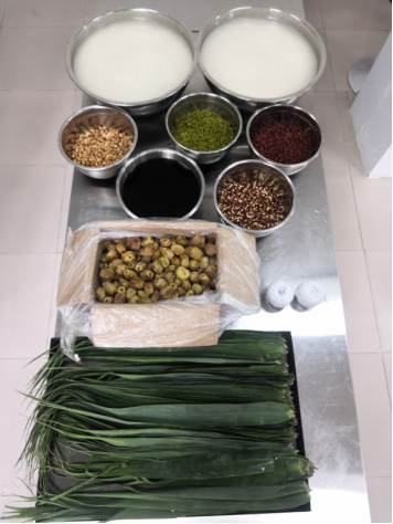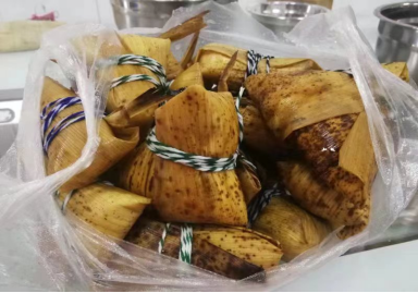 在学校的烘焙实训室,同学们兴奋地围在老师们的身边学着包粽子的手法:一折叶,二盛料,三压实,四包,五扎绳,看似简单,但要做个漂亮的粽子还是需要一点功夫的,在老师和同学们的共同努力下,红豆粽、蜜枣粽出笼啦!虽然包出来的粽子大小不一、形状各异,但是大家完全沉浸在自己动手的快乐中。