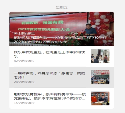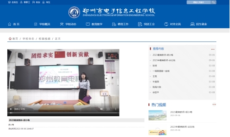 充分利用融媒体,做好视频宣传。2023年郑州市最美教师发布仪式后,学校及时下载最美教师的宣传片及电子相册并在校园显示屏、校园网站播放。