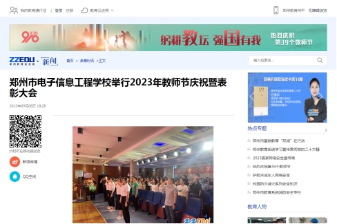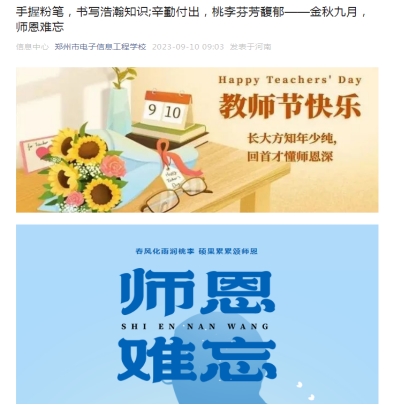 根据郑教师函[2023]610文的要求,认真组织做好教师节庆祝工作,今年是第39个教师节,本次教师节宣传主题“躬耕教坛,强国有我”。为大力弘扬高尚师德师风,引导激励广大教师和教育工作者坚定理想信念,厚植爱国情怀、涵养高尚师德,按照各级文件要求,我校大力进行宣传教育活动。
