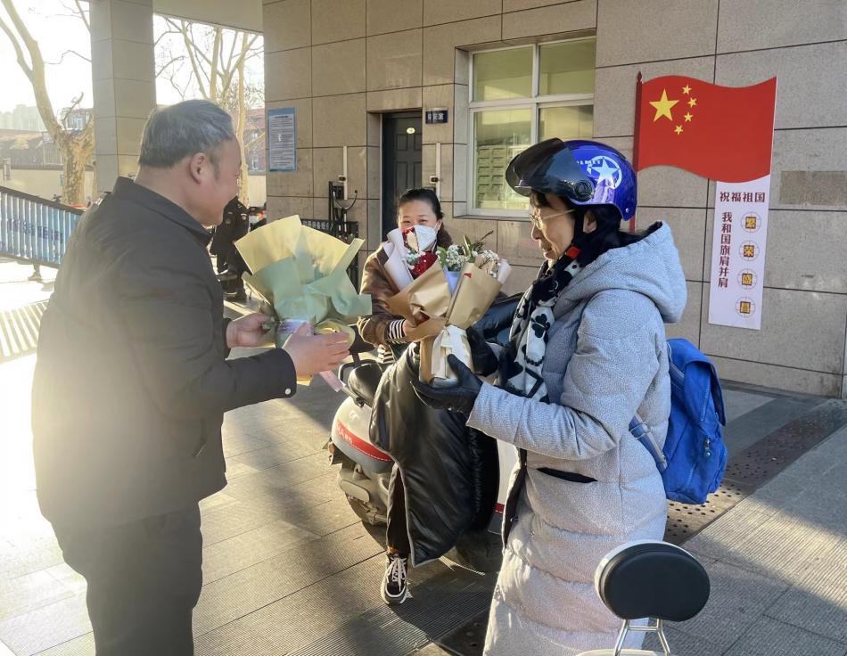 3月8日清晨,郑州市电子信息工程学校党委书记、校长李京辉、副校长高勤华、工会主席郭宝生、副校长李向伟在校门口等候,为上班的女教职工们献上一束美丽的鲜花并送上节日的祝福!一束芬芳的鲜花,一句温馨的话语,表达着学校领导对女教师的关心与爱护,校园里处处洋溢着温馨幸福的氛围。陆续前来上班的女教职工们从校领导手里接过送给自己的鲜花后欣喜不已,脸上都洋溢起了幸福的微笑,大家纷纷与校领导们合影留念,记录下这美好瞬间。