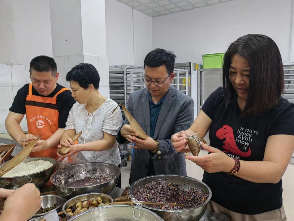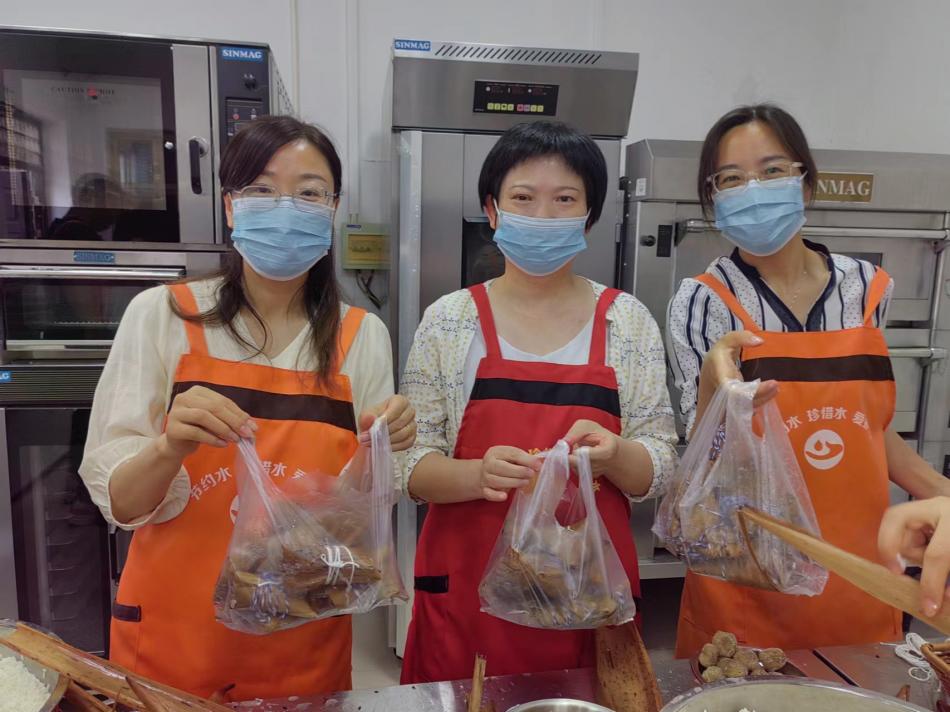在学校的烘焙实训室,同学们兴奋地围在老师们的身边学着包粽子的手法:一折叶,二盛料,三压实,四包,五扎绳,看似简单,但要做个漂亮的粽子还是需要一点功夫的,在老师和同学们的共同努力下,红豆粽、蜜枣粽出笼啦!虽然包出来的粽子大小不一、形状各异,但是大家完全沉浸在自己动手的快乐中。