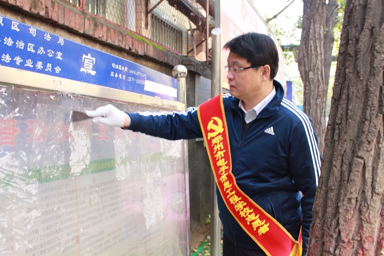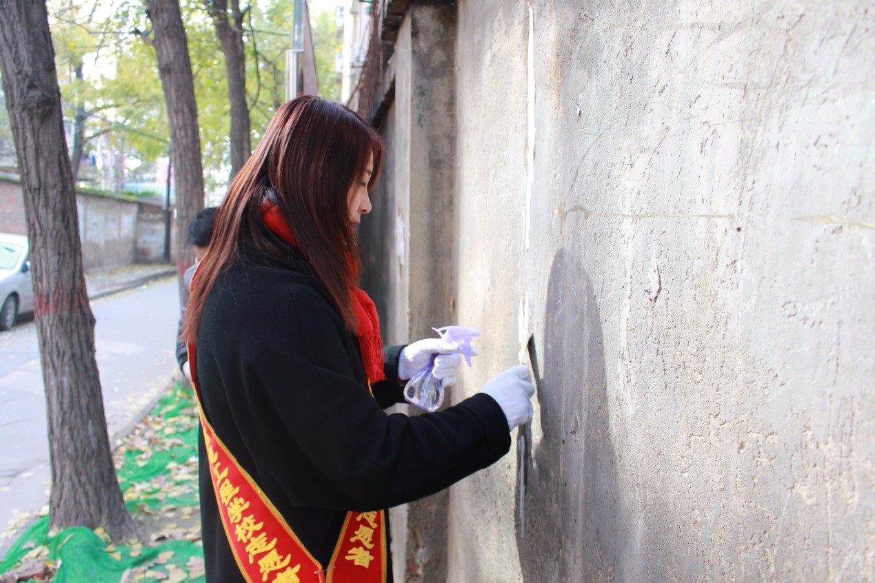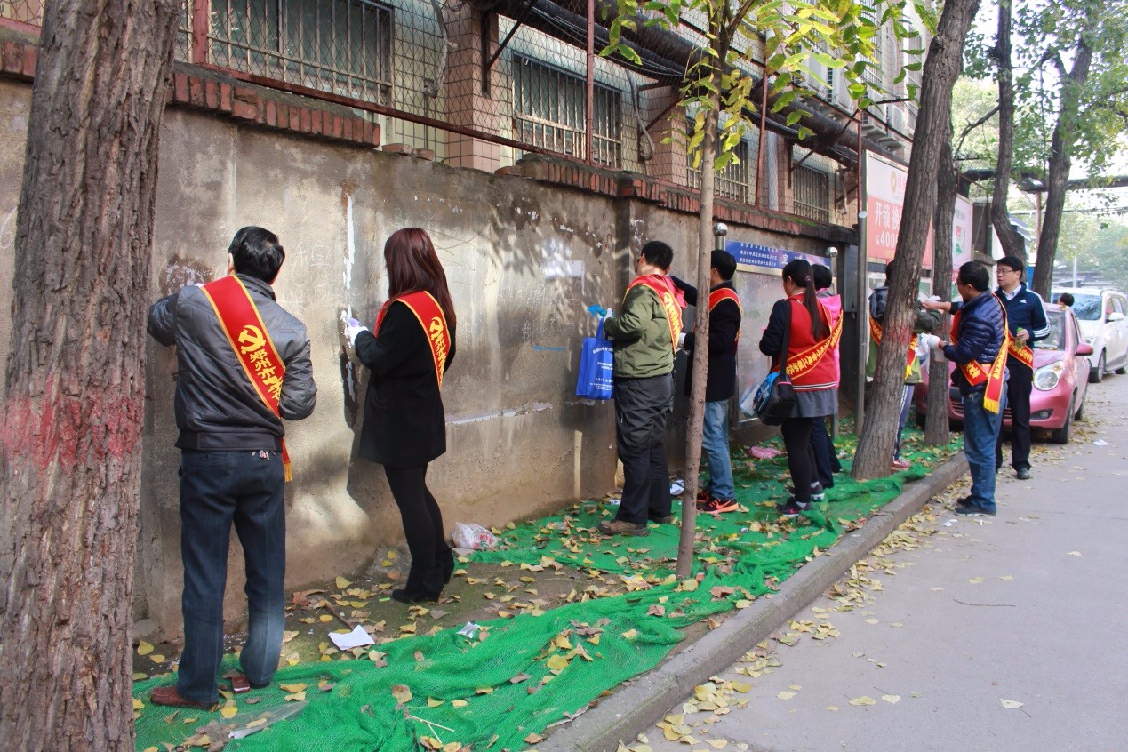 11月11日上午,郑州市电子信息工程学校组织党员志愿者前往思源社区开展清除“牛皮癣”活动。