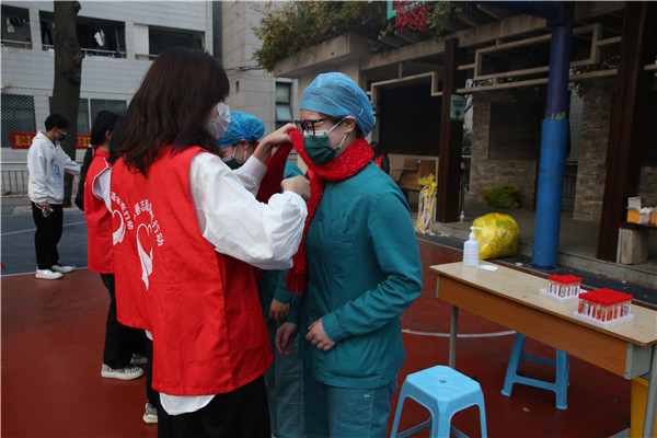 核酸检测点的医护人员管艳华说,这次核酸检测,大家都特别配合,排队、扫码、登记、取样一切都井然有序,速度也加快了很多。今天收到这份特殊的礼物既意外又感动,孩子们太有心了,手工织的围巾好看还暖和,让人心里也暖暖地,有大家的认可和鼓励,感觉所有的辛苦都是值得。疫情防控是一场全民战疫,相信有大家的共同参与和努力我们一定能早日战胜疫情。