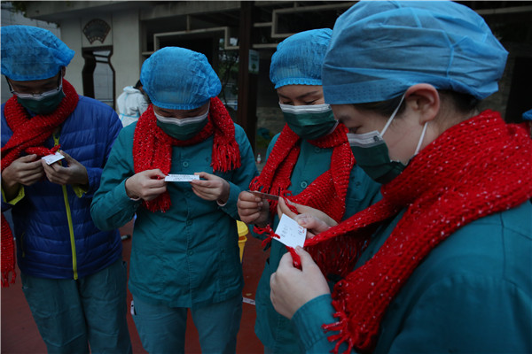 医护人员认真观看卡片寄语