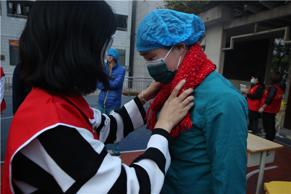 志愿者向医护人员送围巾表关爱