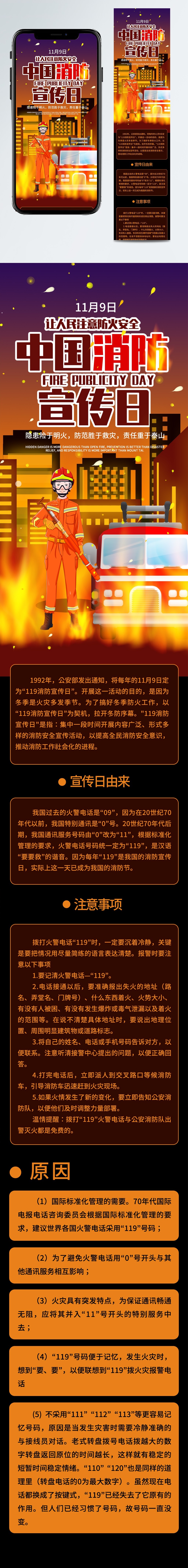 11月9日的月日数恰好与火警电话号码119相同,而且这一天前后,正值风干物燥、火灾多发之际,全国各地都在紧锣密鼓地开展冬季防火工作。为增强全民的消防安全意识,使“119”更加深入人心,公安部在一些省市进行“119”消防活动的基础上,于1992年发起,将每年的11月9日定为全国的“消防宣传日”。