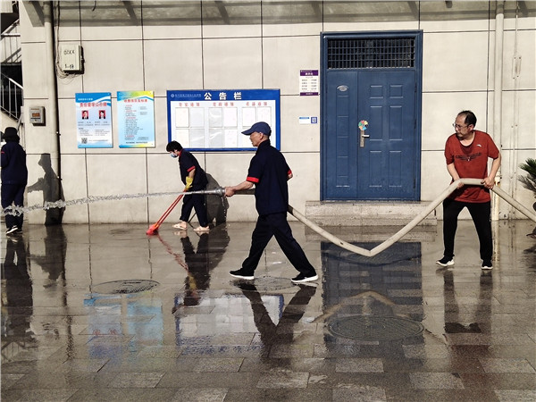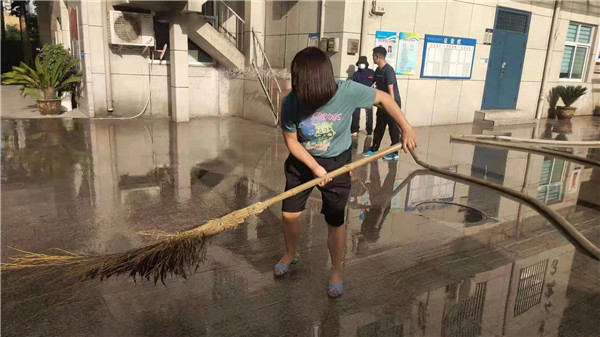 在此期间,因忙于工作迟迟找不到空闲去医院输液的辛老师,哪怕衣衫湿透、灰尘满面、满身疲惫,仍始终坚持在校园环境卫生第一线。