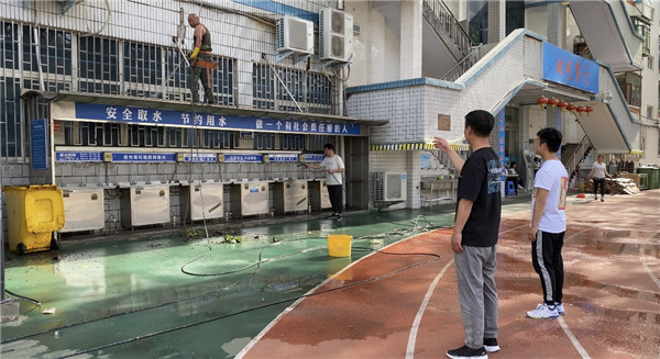 后勤工作细碎、繁冗,要事无巨细处处留心,难度极大。为给大赛营造美好的校园环境,后勤服务组项目负责人于蓉副校长对赛前校园维修、建筑物外墙清洁、校园环境卫生大扫除,清除卫生死角,冲刷运动场及前院地面,清理大门口过厅墙壁污渍等各方面统筹安排,带领后勤服务组全体成员克服天气炎热,设备单一等困难,亲力亲为,一点点用水管、扫帚冲洗校园,加班加点对全校的环境卫生进行清理,把学校前院和后院及周边卫生环境进行了全面扫除,清除卫生死角,确保大赛在一个整洁舒适的环境中进行。