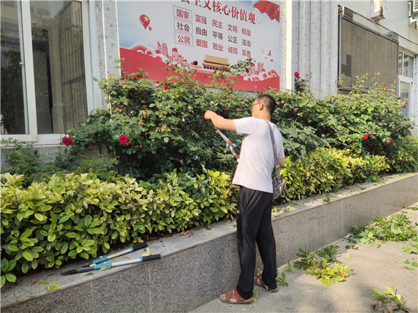 不仅如此,他还带领保洁人员往校园各处打扫、清理遗留地贴、亲自操作水枪冲洗地面、俯身擦洗瓷片上的污渍,他紧盯校园每一片花草、每一盆绿植,精心修剪维护,用心挑选更换。