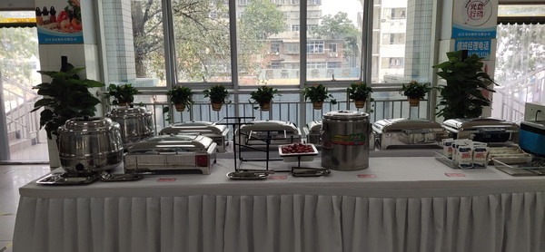 5月31日我校召开大赛说明会,后勤校内用餐及食品安全保障组当天终于迎来第一波检验。与会人员的会后就餐,安排在了学校餐厅,志愿者负责指引安排,就餐采用自助餐形式,受到来宾一致好评。
