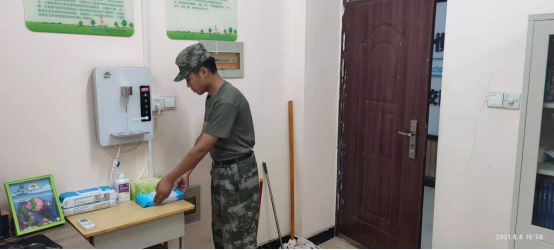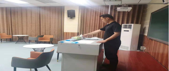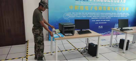 未雨绸缪,防范于未然。距参赛队报道还有两日,防疫组已经把参赛室、评分室、休息室等重要赛事场地的防疫物品摆放到位,以备不时之需,在张念老师的带领下,我校负责寝室管理的教官积极协助。