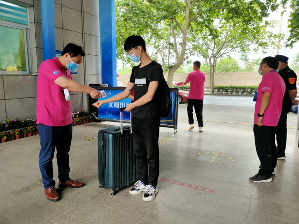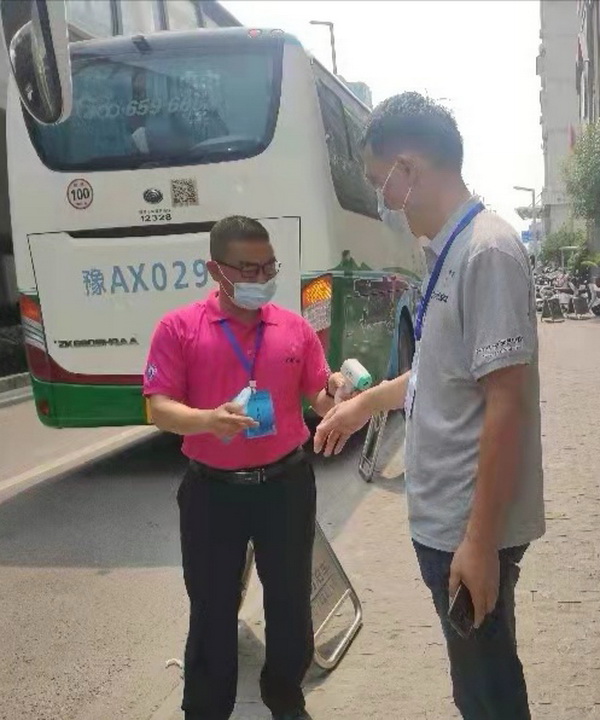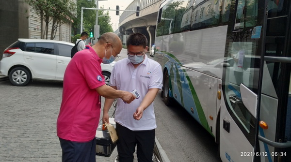 赫建富老师在酷热的天气下对上车的辅导老师进行测温