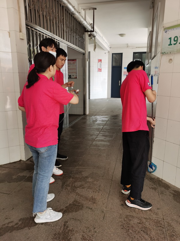 杨晓艳老师带领志愿者对辅导教师休息室外部进行打扫、消毒