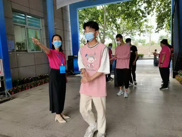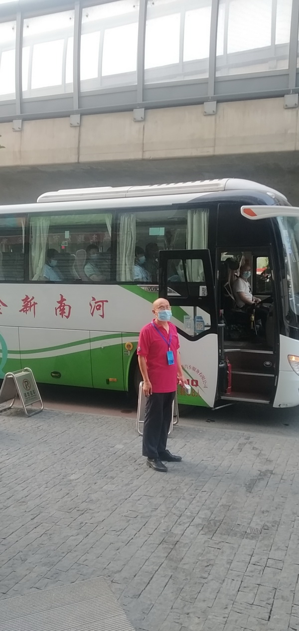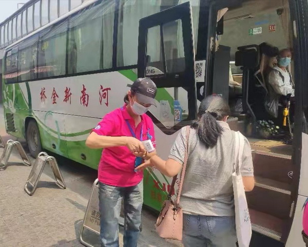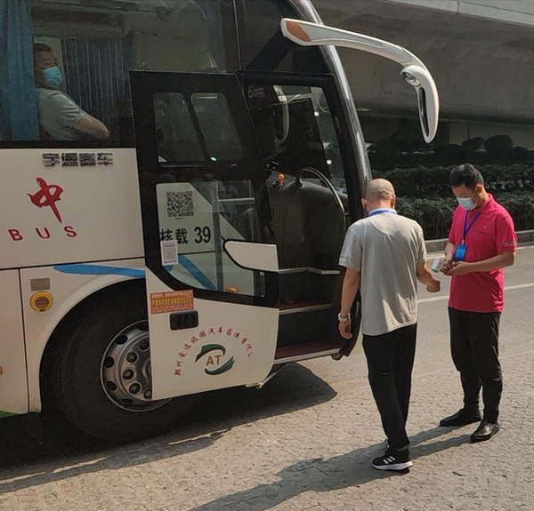 姜汉丽老师在酷热的天气下对上车的辅导老师进行测温
