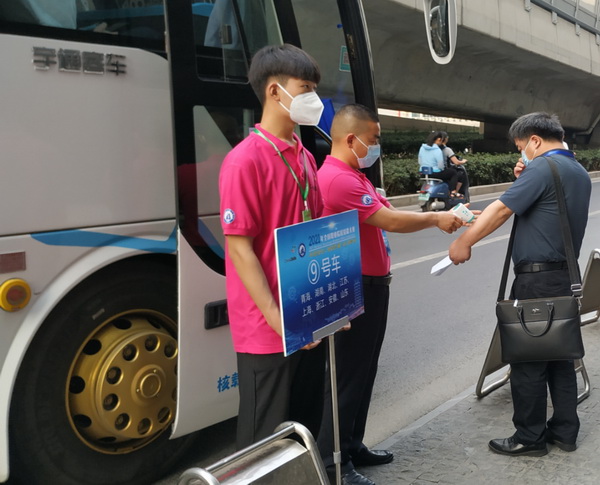 张念老师在酷热的天气下对上车的辅导老师进行测温