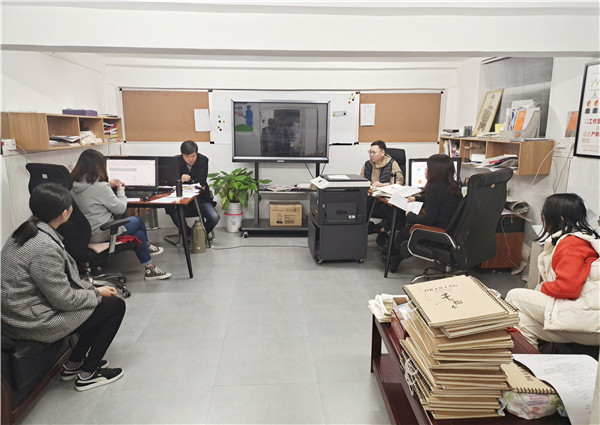 (召开研讨会,平面工作室毛明琪、蒋晨辉、刘珊珊、张郑男、陈雪、李文、韩真老师积极讨论学生展览细节)
